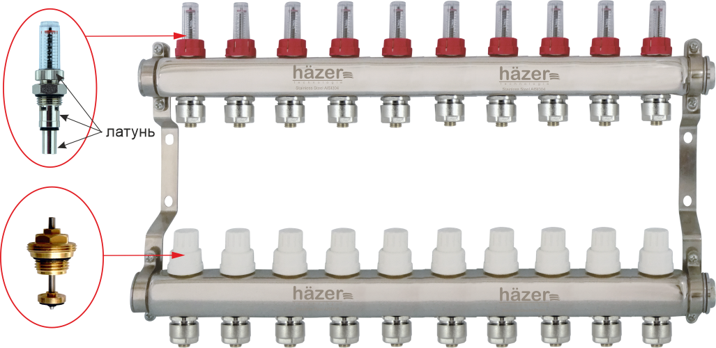 Коллекторний блок hazer technologie (хазер технолоджи) для теплого пола с расходомерами и термостатическими клапанами в индивидуальной упаковке (коробка и вспененный полиэтилен). Входной коллектор с расходомерами, выходной с термостатическими клапанами, с возможностью оборудованимя сервоприводами.