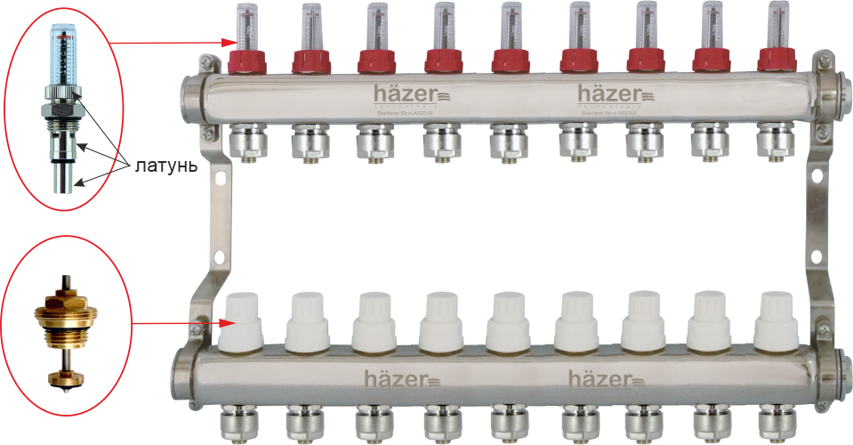 Коллекторний блок hazer technologie (хазер технолоджи) для теплого пола с расходомерами и термостатическими клапанами в индивидуальной упаковке (коробка и вспененный полиэтилен). Входной коллектор с расходомерами, выходной с термостатическими клапанами, с возможностью оборудованимя сервоприводами.