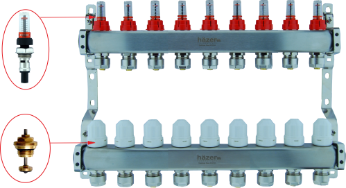 Коллекторный блок hazer technologie (хазер технолоджи) для теплого пола с расходомерами и термостатическими клапанами в индивидуальной упаковке (коробка и вспененный полиэтилен). Входной коллектор с расходомерами, выходной с ручными термостатическими клапанами, с возможностью установки сервоприводов. Картридж термостатического клапана полностью латунный.