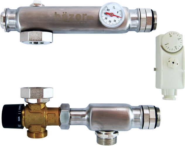 Смесительный узел нержавеющий hazer technologie (хазер технолоджи) с термостатическим смесительным клапаном для теплого пола в индивидуальной упаковке(коробка и вспененный полиэтилен).