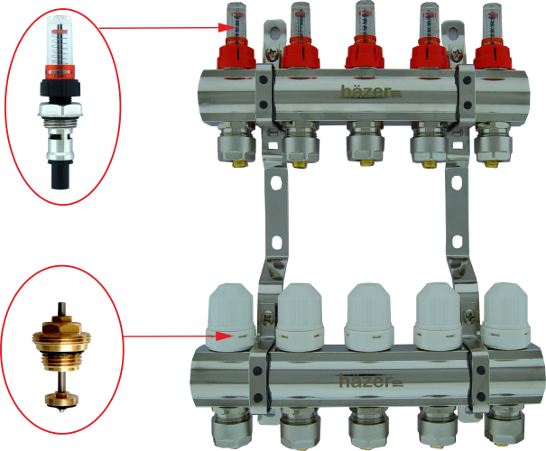 Колекторний блок hazer technologie (хазер технолоджи) для теплої підлоги з витратомірами та термостатичними клапанами в індівідуальній упаковці (коробка та вспінений поліетилен). Вхідний колектор з витратомірами, вихідний з ручними термостатичними клапанами, з можливістю обладнання сервоприводами.