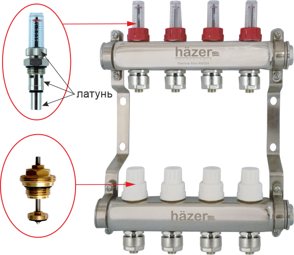 Колекторний блок hazer technologie (хазер технолоджи) для теплої підлоги з витратомірами та термостатичними клапанами в індівідуальній упаковці (коробка та вспінений поліетилен). Вхідний колектор з витратомірами, вихідний з ручними термостатичними клапанами, з можливістю обладнання сервоприводами.