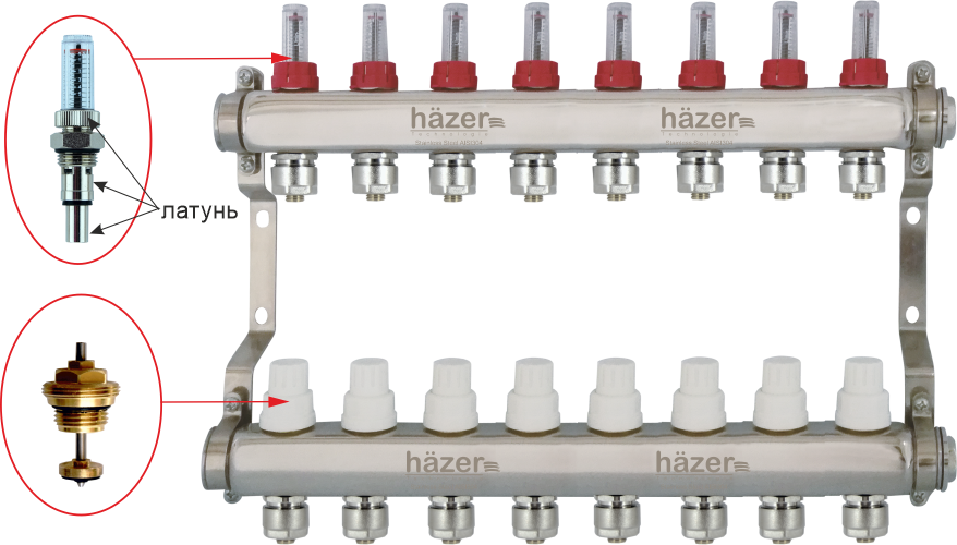 Колекторний блок hazer technologie (хазер технолоджи) для теплої підлоги з витратомірами та термостатичними клапанами в індівідуальній упаковці (коробка та вспінений поліетилен). Вхідний колектор з витратомірами, вихідний з ручними термостатичними клапанами, з можливістю обладнання сервоприводами.