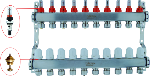 Колекторний блок hazer technologie (хазер технолоджи) для теплої підлоги з витратомірами та термостатичними клапанами в індівідуальній упаковці (коробка та вспінений поліетилен). Вхідний колектор з витратомірами, вихідний з ручними термостатичними клапанами, з можливістю обладнання сервоприводами.