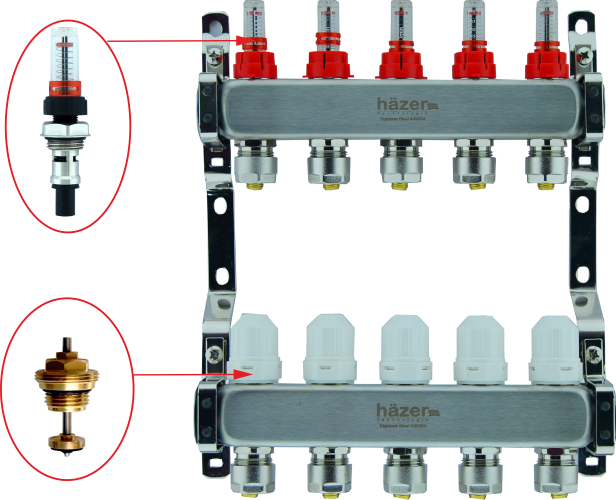 Колекторний блок hazer technologie (хазер технолоджи) для теплої підлоги з витратомірами та термостатичними клапанами в індівідуальній упаковці (коробка та вспінений поліетилен). Вхідний колектор з витратомірами, вихідний з ручними термостатичними клапанами, з можливістю обладнання сервоприводами.